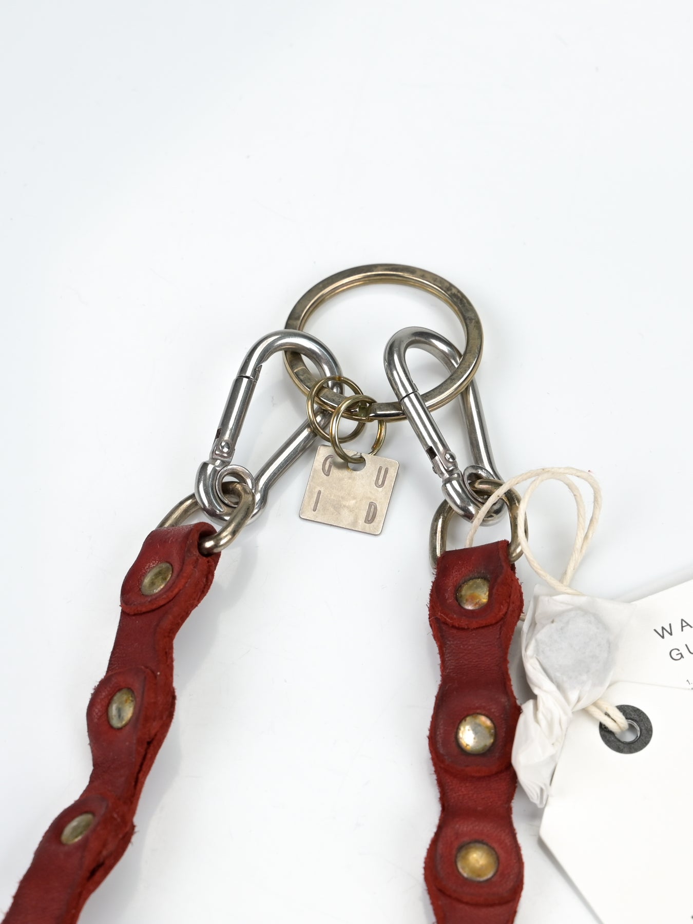 Rivets at length. Logo plaque at keyring. Lanyard-clasp fastenings. Antiqued silver-tone hardware. L27.5" x W0.5". Made in Italy.