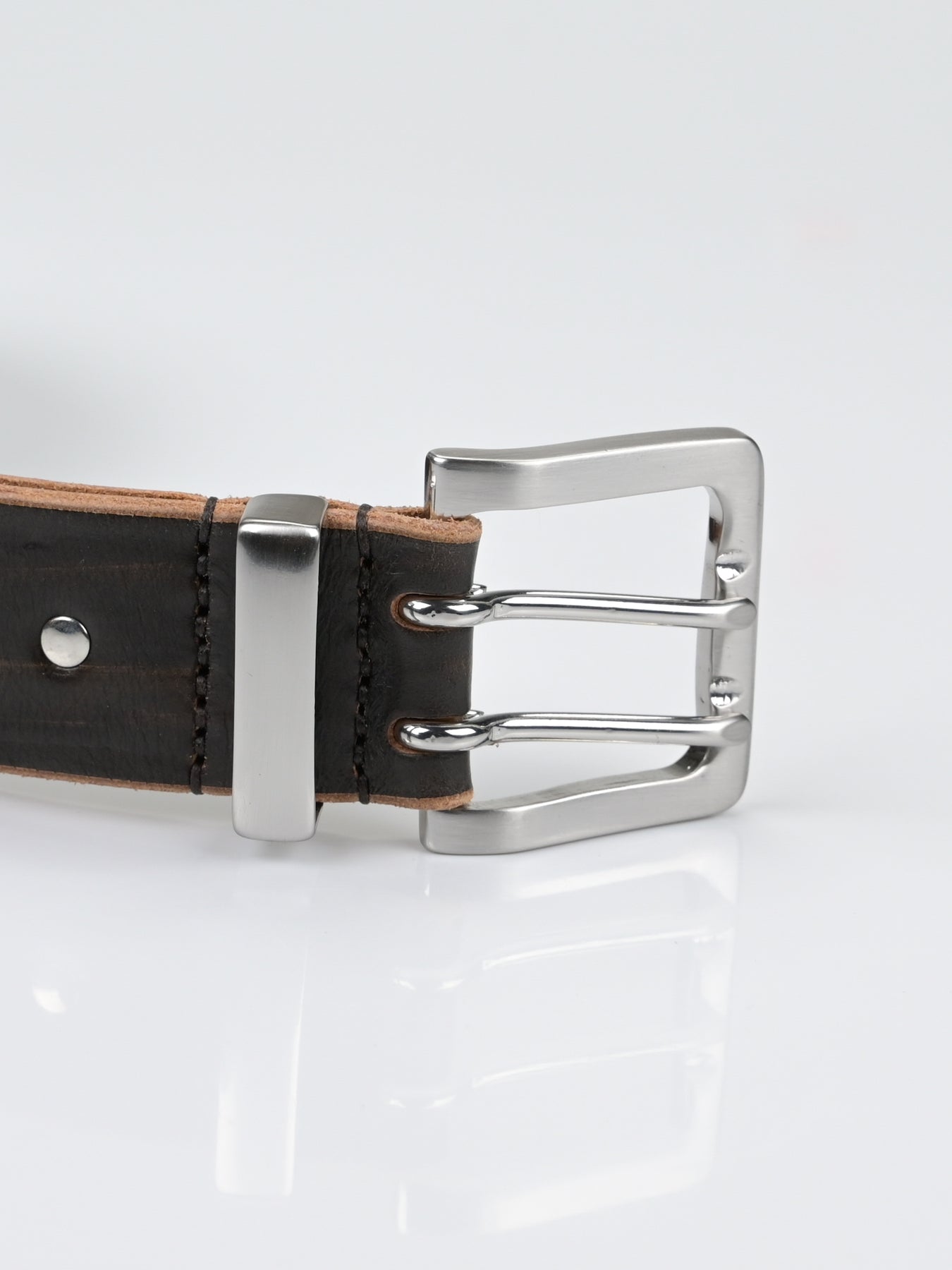 Our Legacy 4 cm Double Tongue Belt in Black Vintage Leather. Produced in a Portuguese leather with a used vintage effect, the belt is 4 cm wide and features a metal double pin buckle closure, a metal keeper, a metal tip and a dust bag cover.