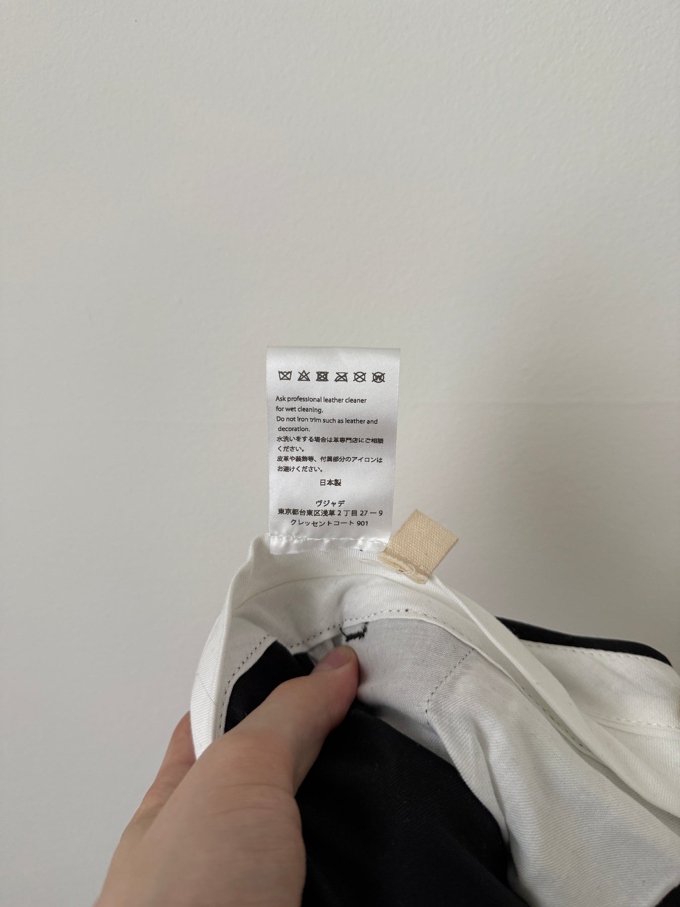The cut of the trousers is a straight fit with the option for a flare hem. They recommend to go true to size or to size down for a fitted look. Made in Japan. 1 of 100.