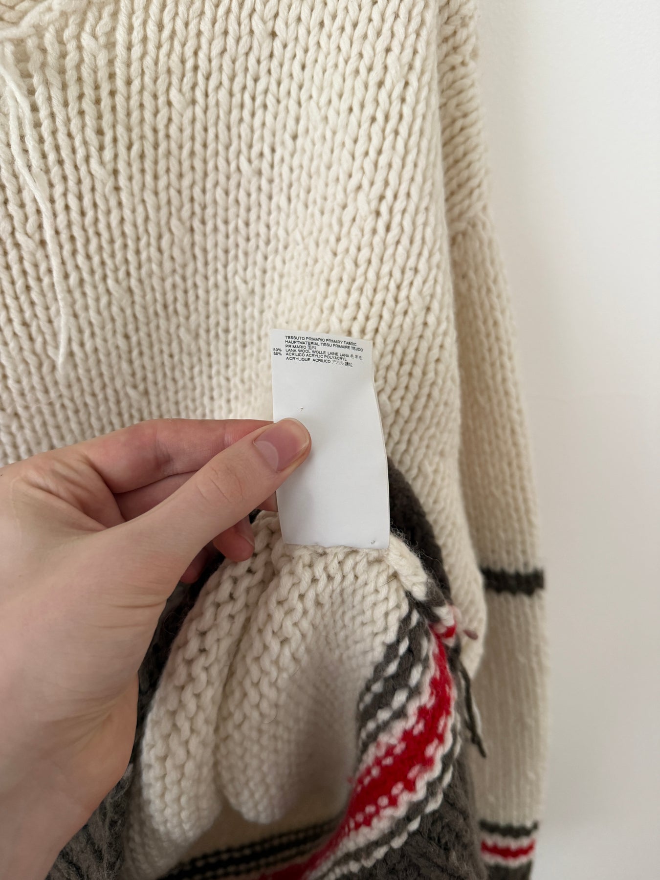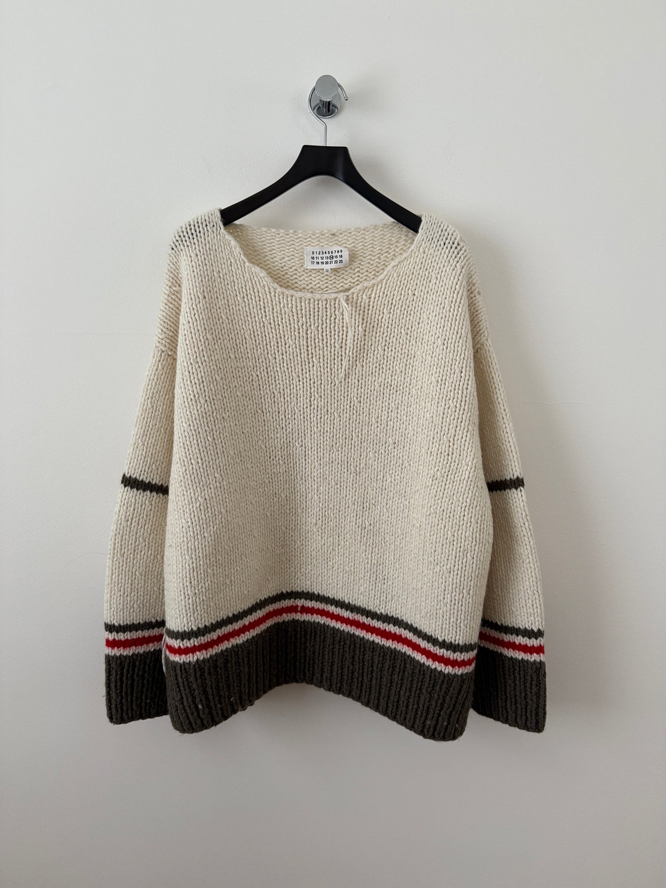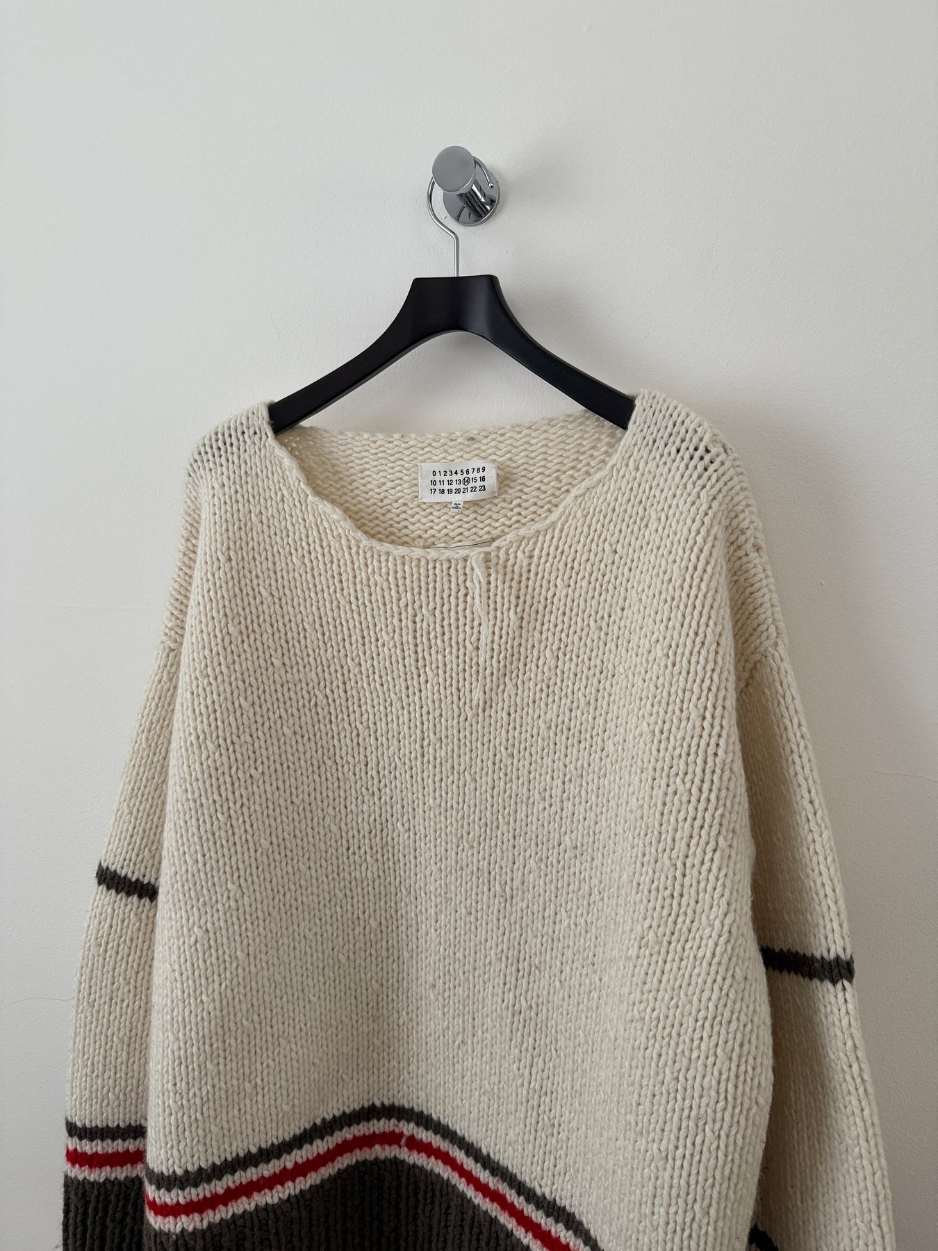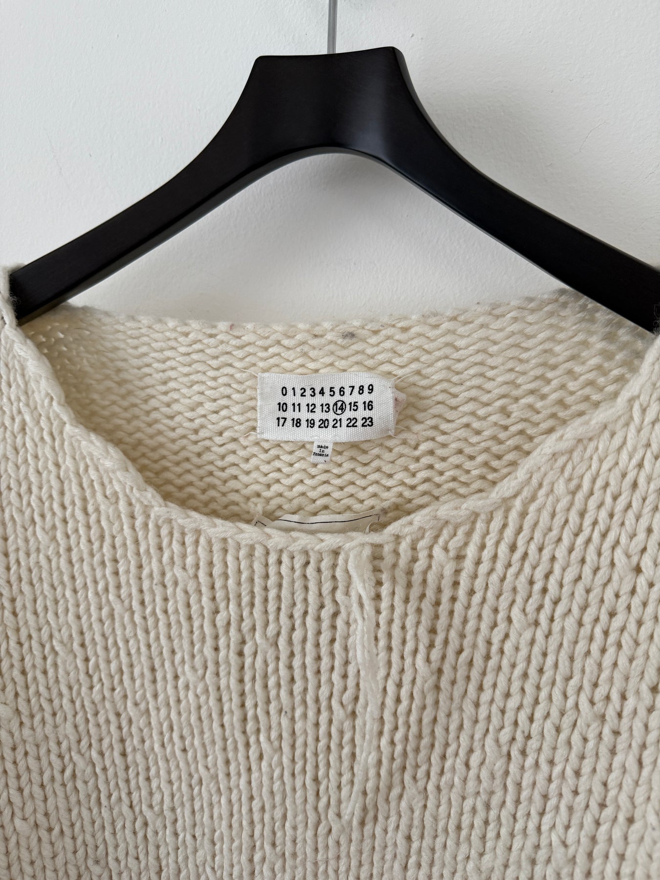 Intentionally frayed at the hem and sleeves. Chunky knit, oversized. Really cool piece with some history, in a very rare size. Replica is one of Margiela's diffusion lines which reproduces garments from different periods. The original inspiration for this piece was an unfinished hand-knitted children's jumper found in Paris from the 1970s, which was then scaled up 300%.
