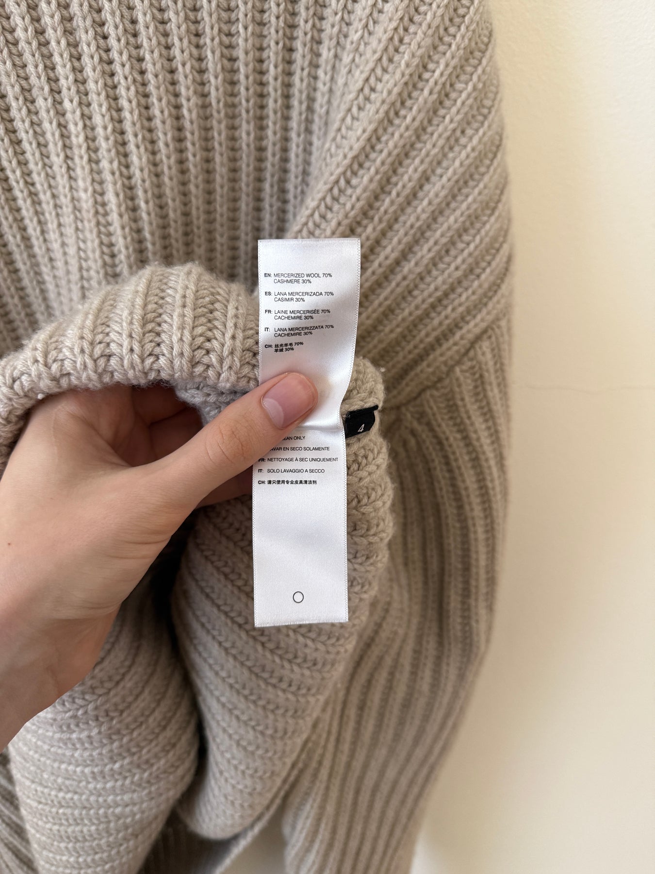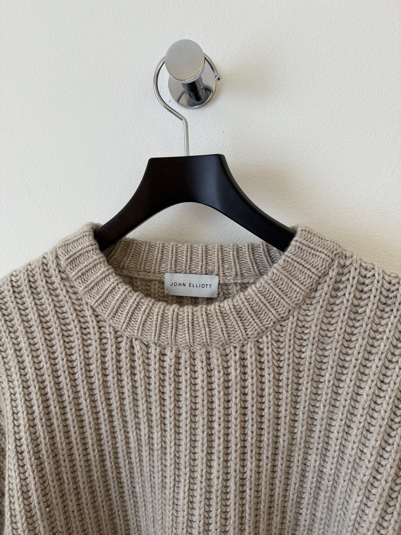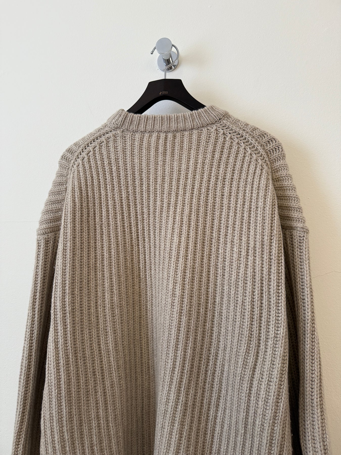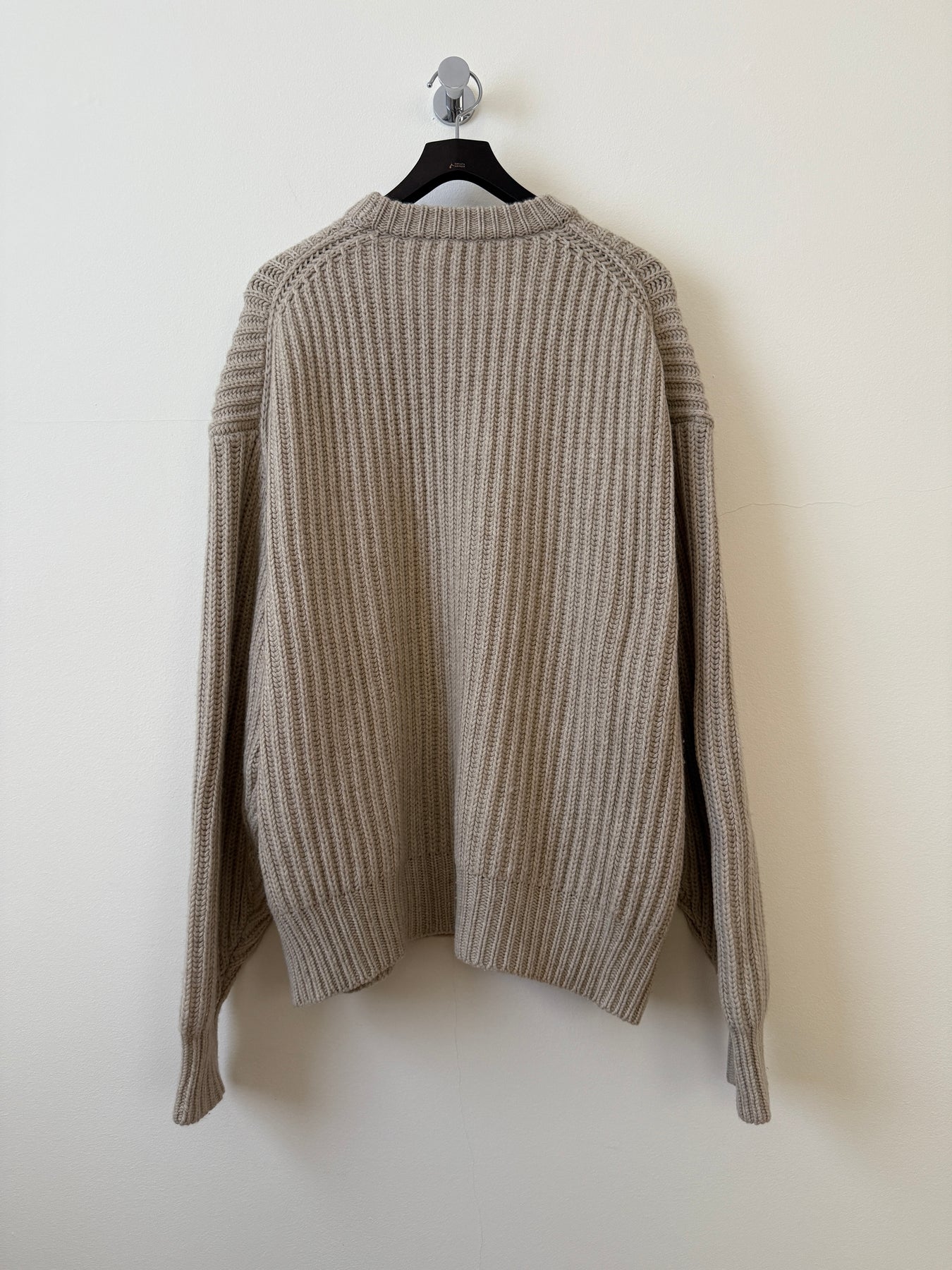 Relaxed fit heavy-weight fisherman rib crewneck sweater. Rib knit collar, cuffs, and hem. 30% cashmere / 70% wool with a full cardigan stitch.
