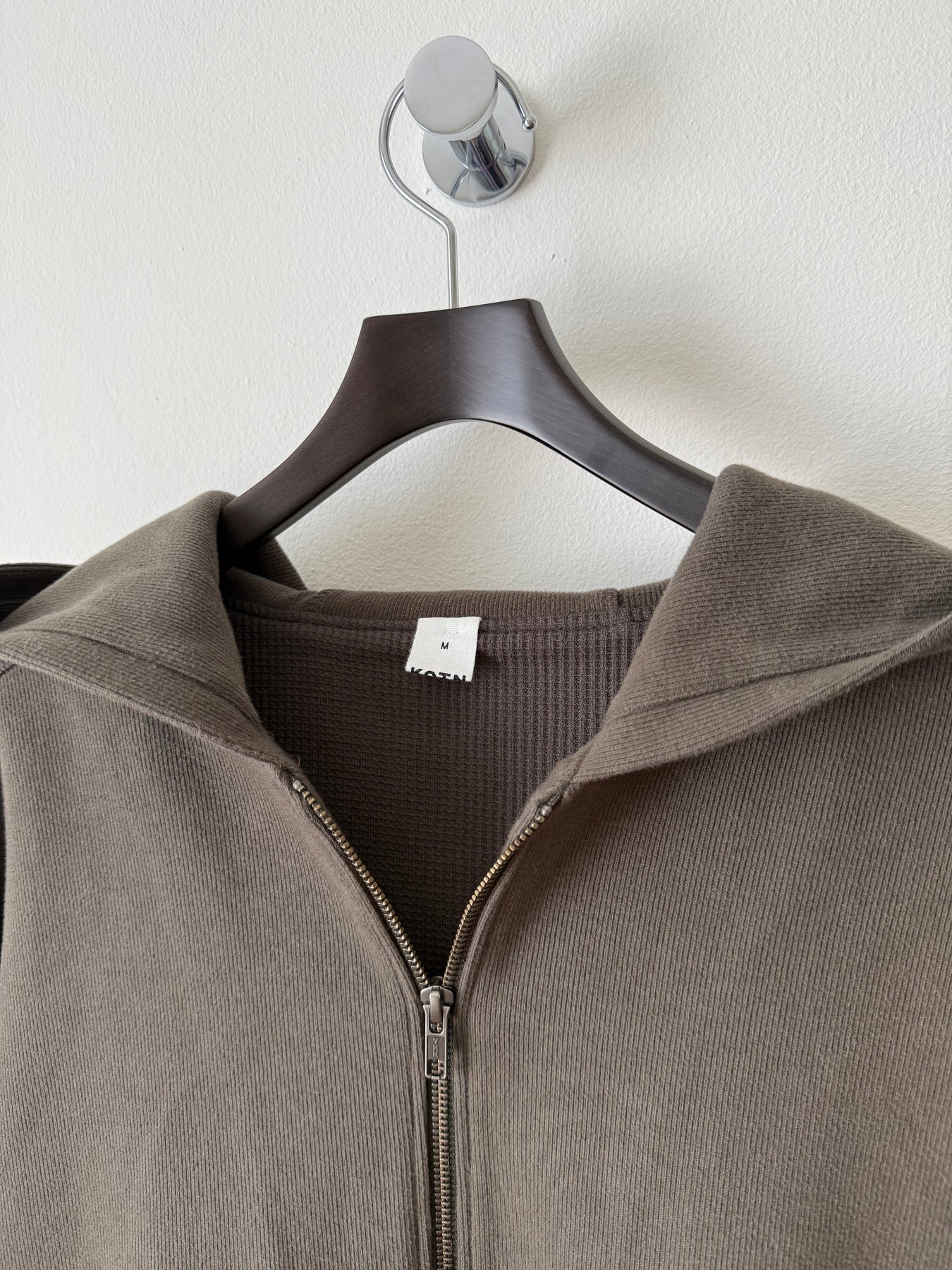 Kotn Cozy Zip Up Thermal Hoodie. Retail was ~$150. Nice shade of brown. Thick, great for this season. Big hood, drop shoulders, hidden slit pockets. Made of 100% Egyptian Cotton.