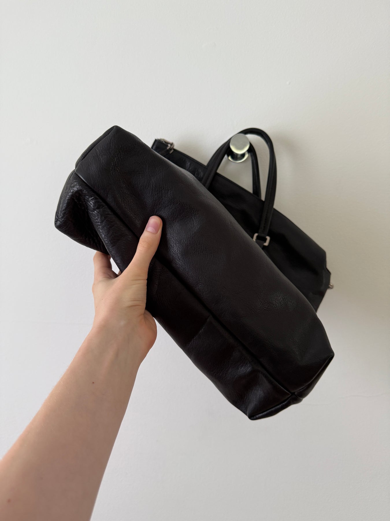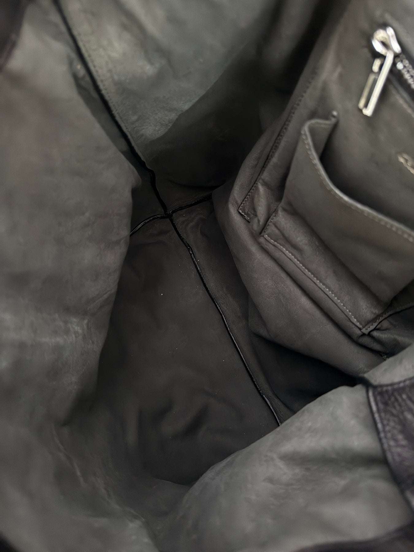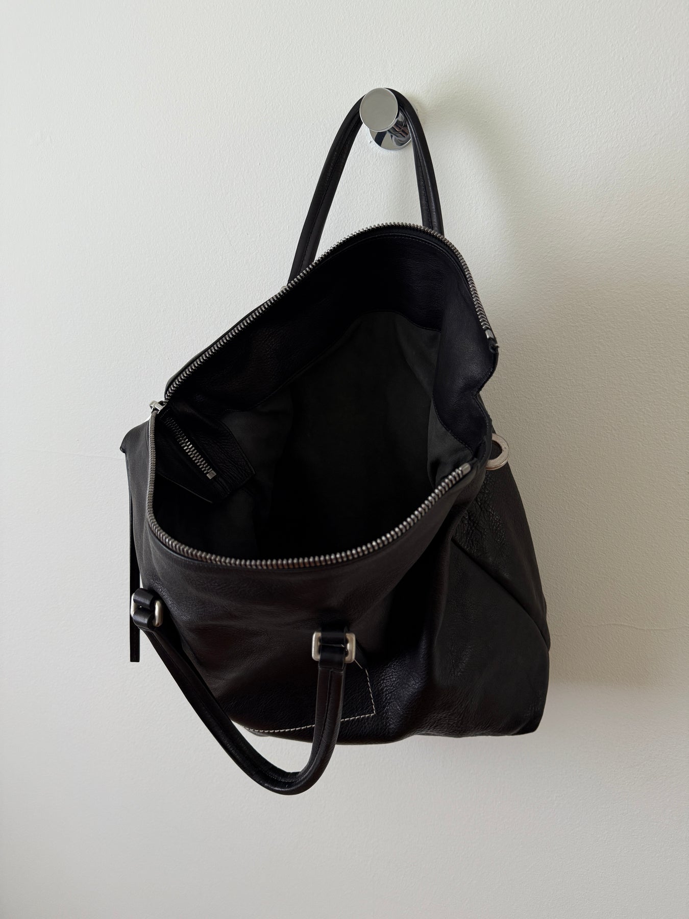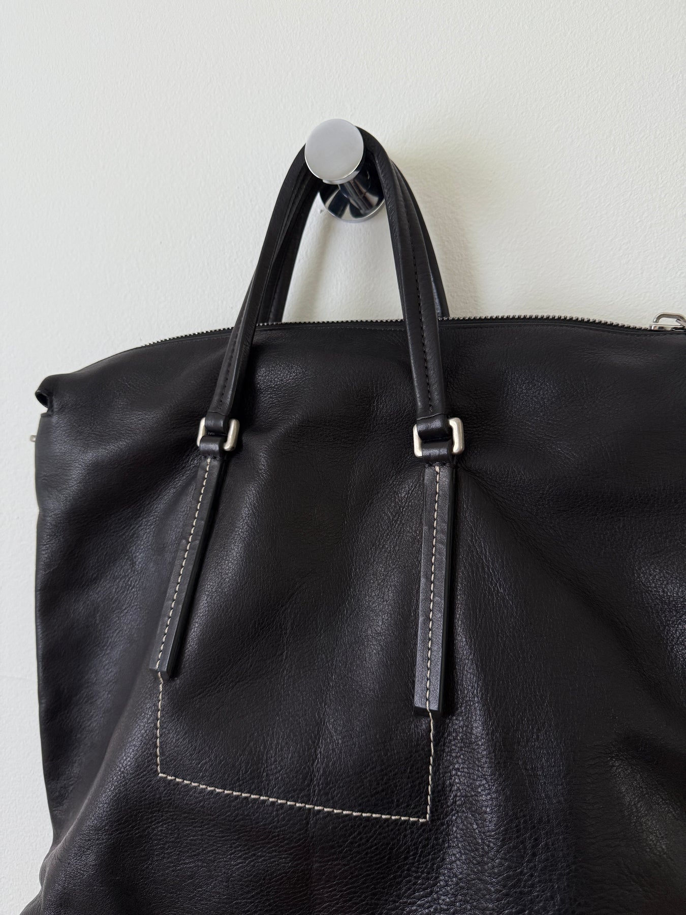 Black Leather. Silver-Tone Hardware. White stitch detailing. Suede lining & Three Interior Pockets. Zip closure at Top. Leather pulls on zippers. No side strap included sadly.