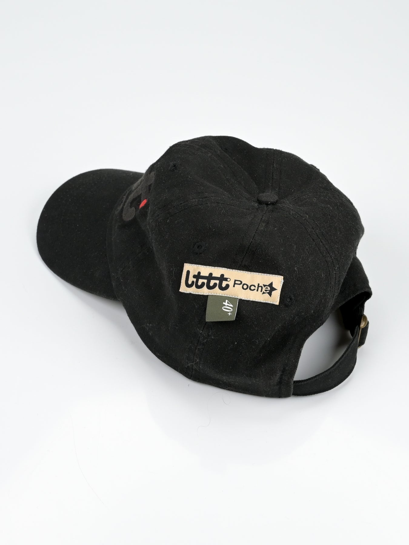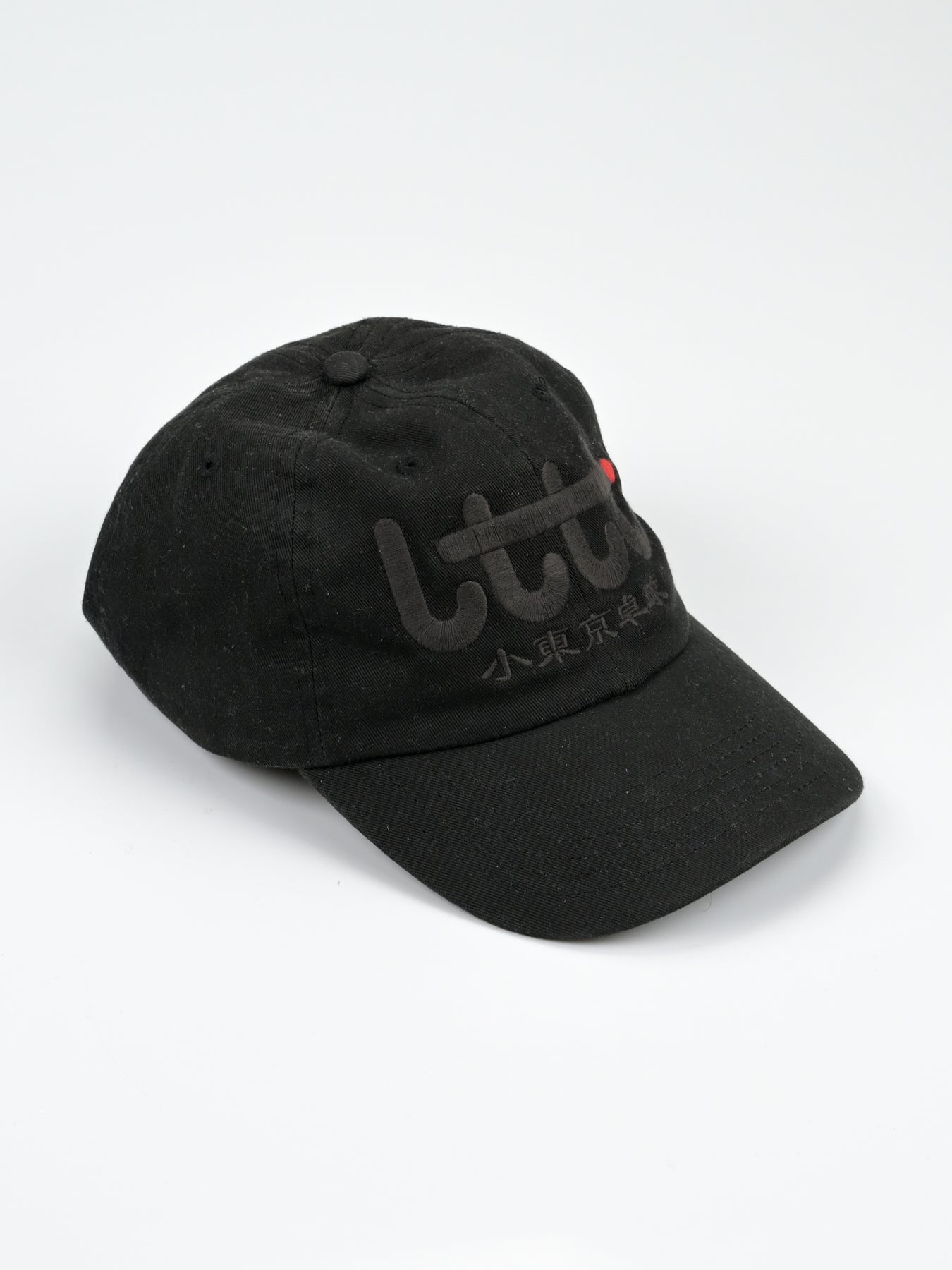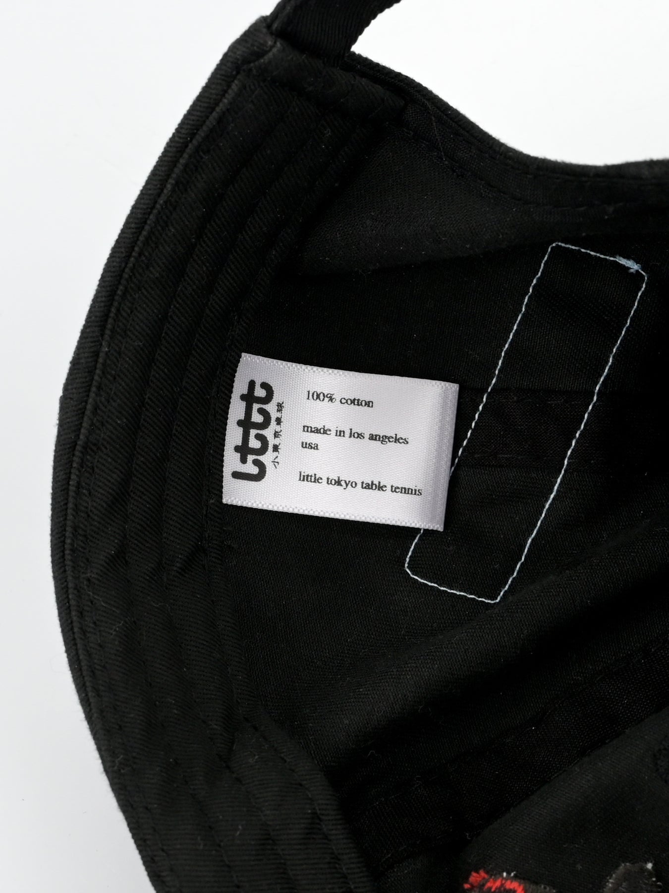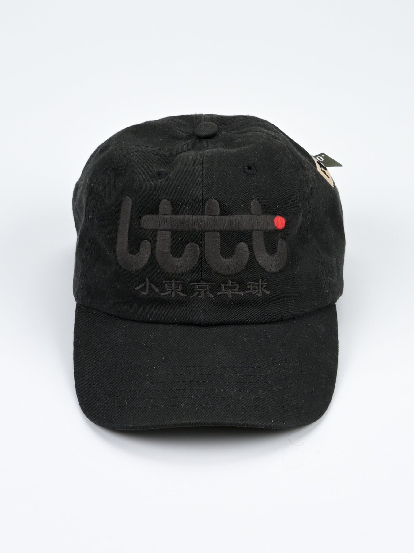 LTTT Club CAP in Black / Black. Eternal little tokyo table tennis logo. Embroidery 4.5 inches wide center front. LTTT/Poche woven label and tab label.