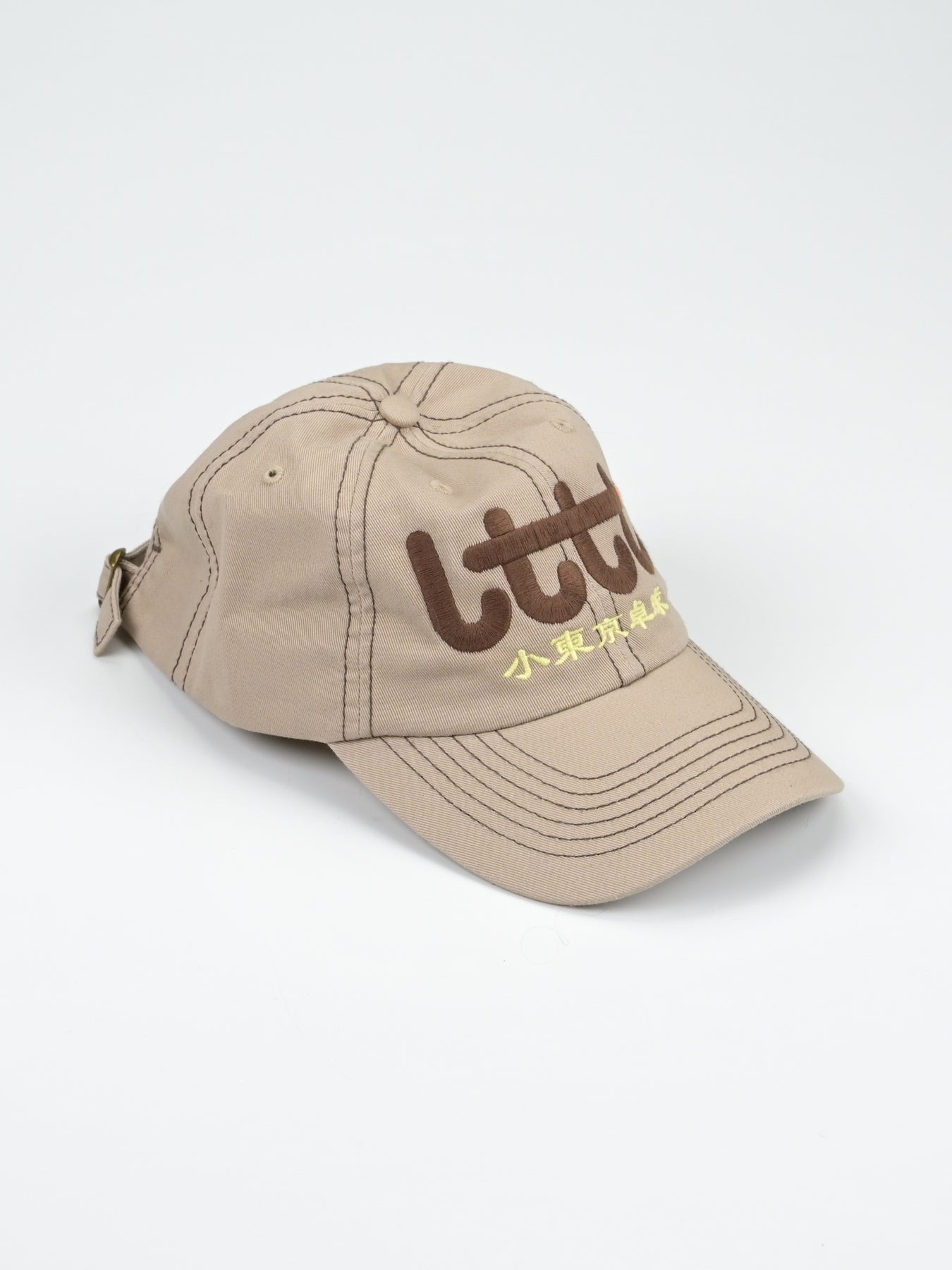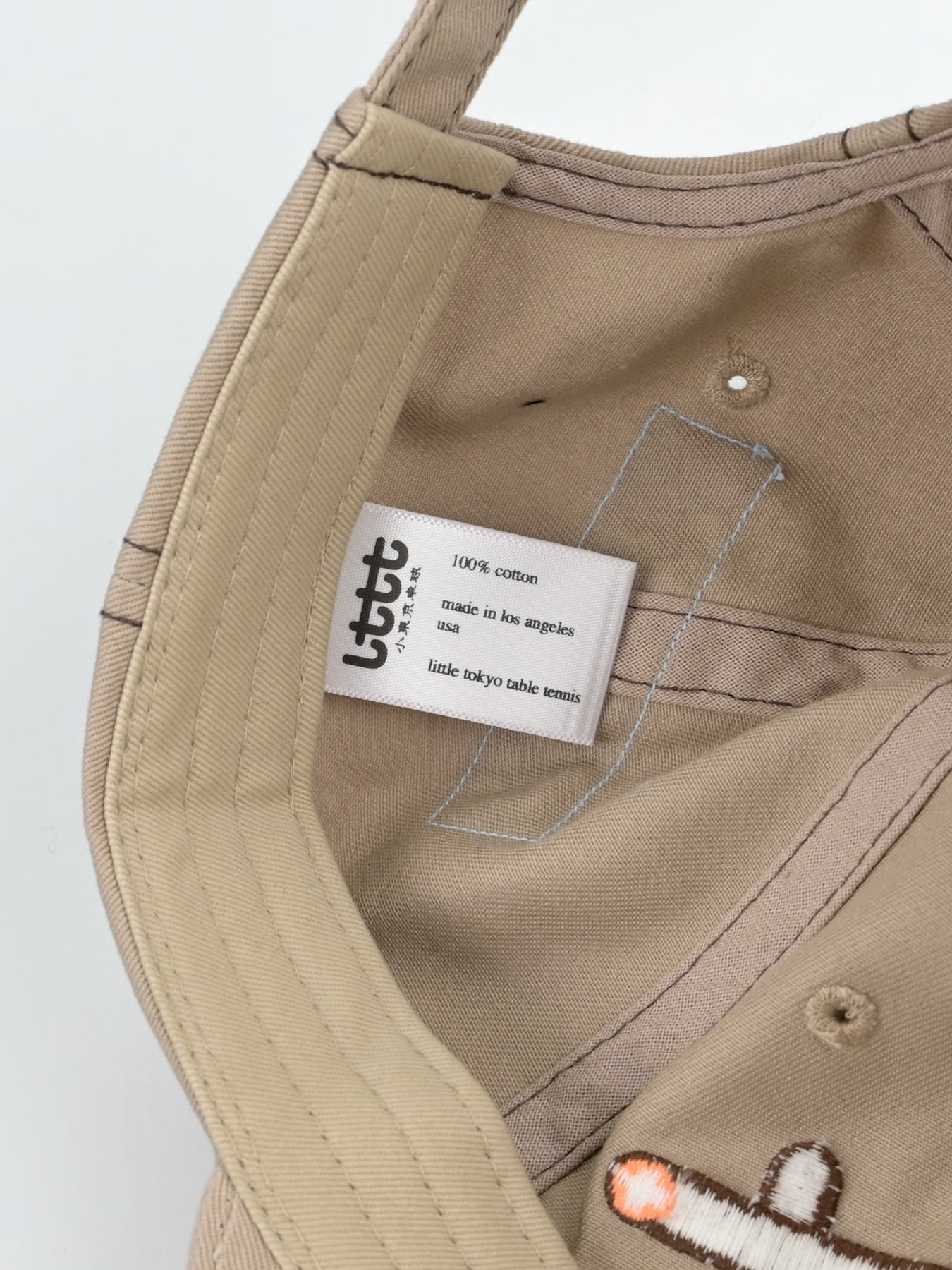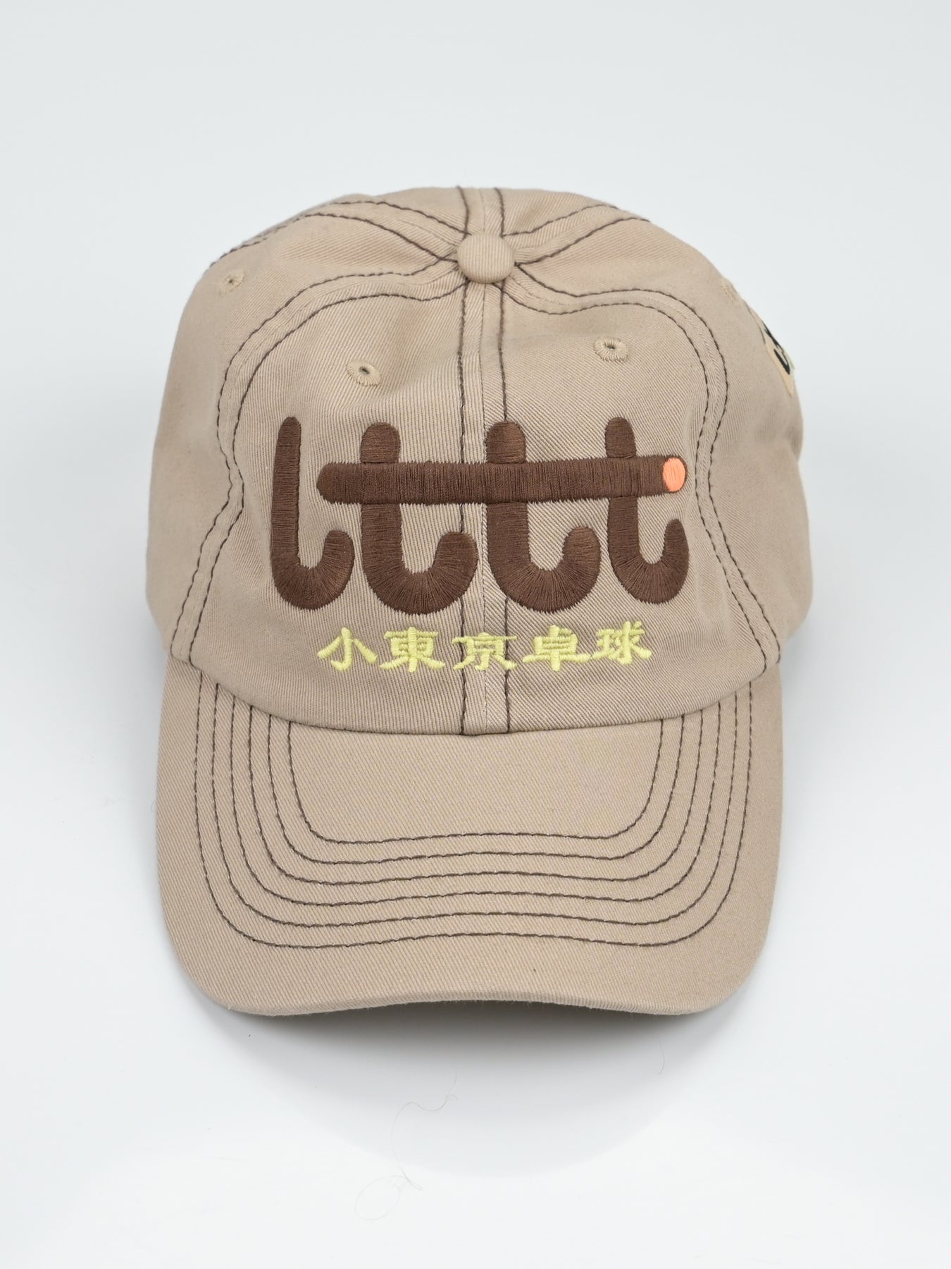 LTTT Club CAP in Khaki. Eternal little tokyo table tennis logo. Embroidery 4.5 inches wide center front. LTTT/Poche woven label and tab label.