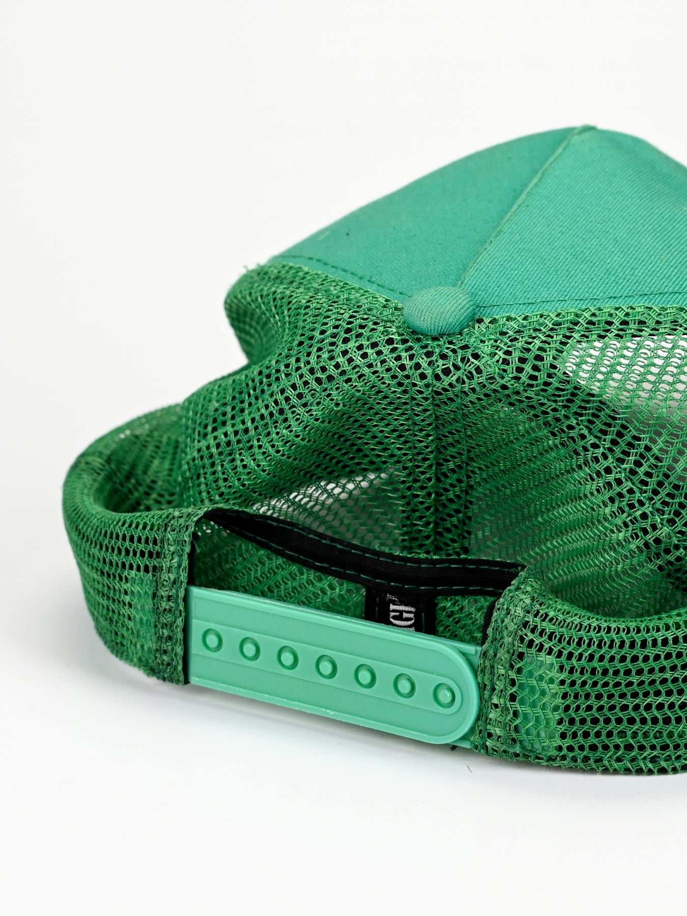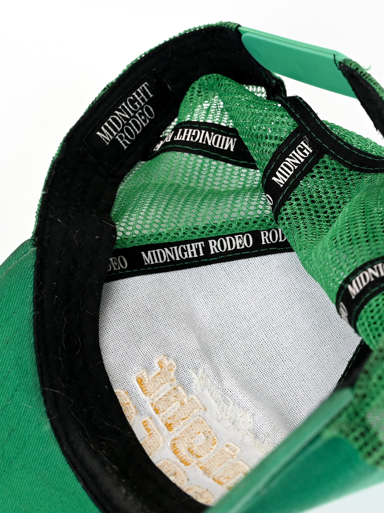 The Midnight Rodeo “Nightlife Odyssey” trucker hat in green features detailed embroidery that emphasizes the undying spirit of New York City and its relation to nightlife.