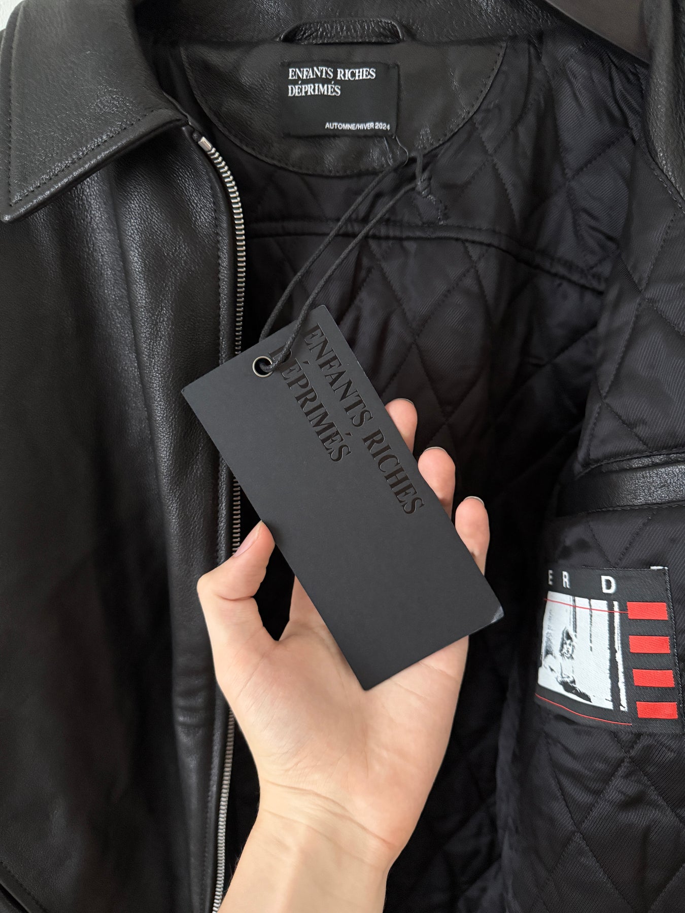 Black grained soft lamb leather jacket. White ERD gothic logo embroidered. Quilted / padded lining. Cut in a classic blouson shape. Neat collar and sloped shoulders.