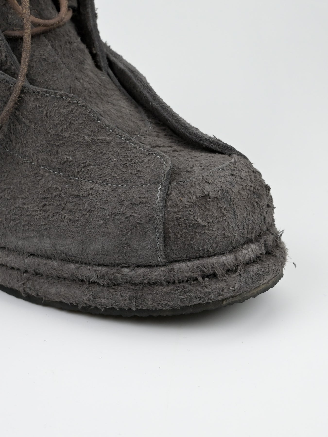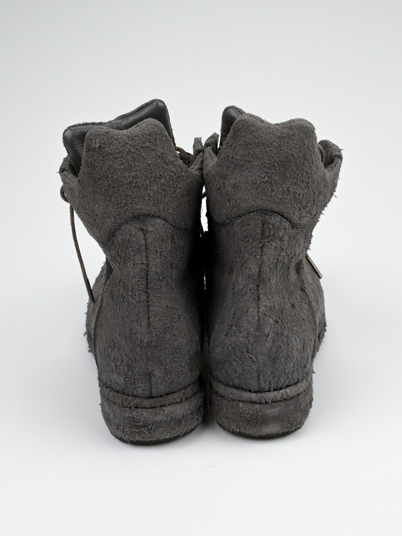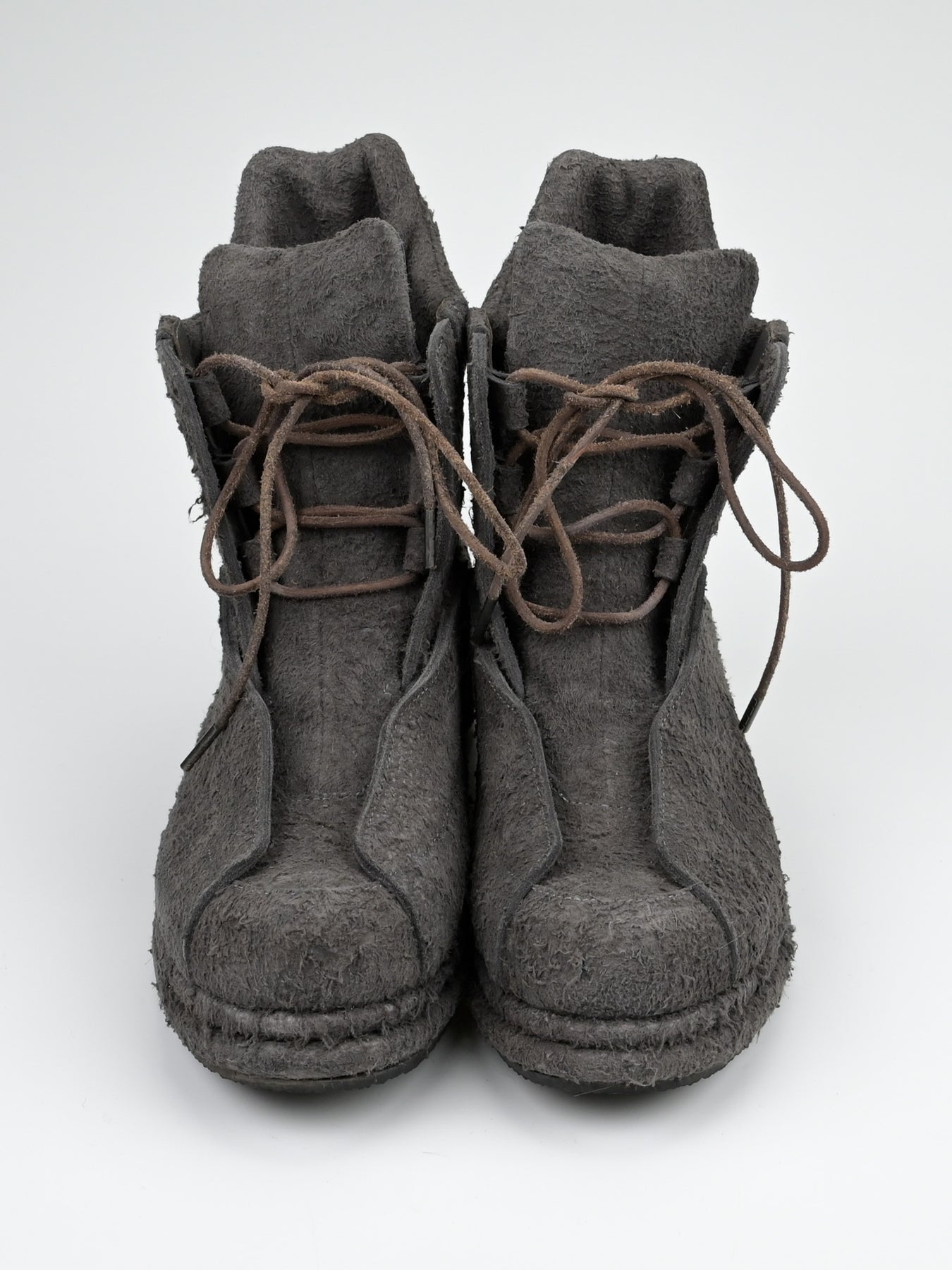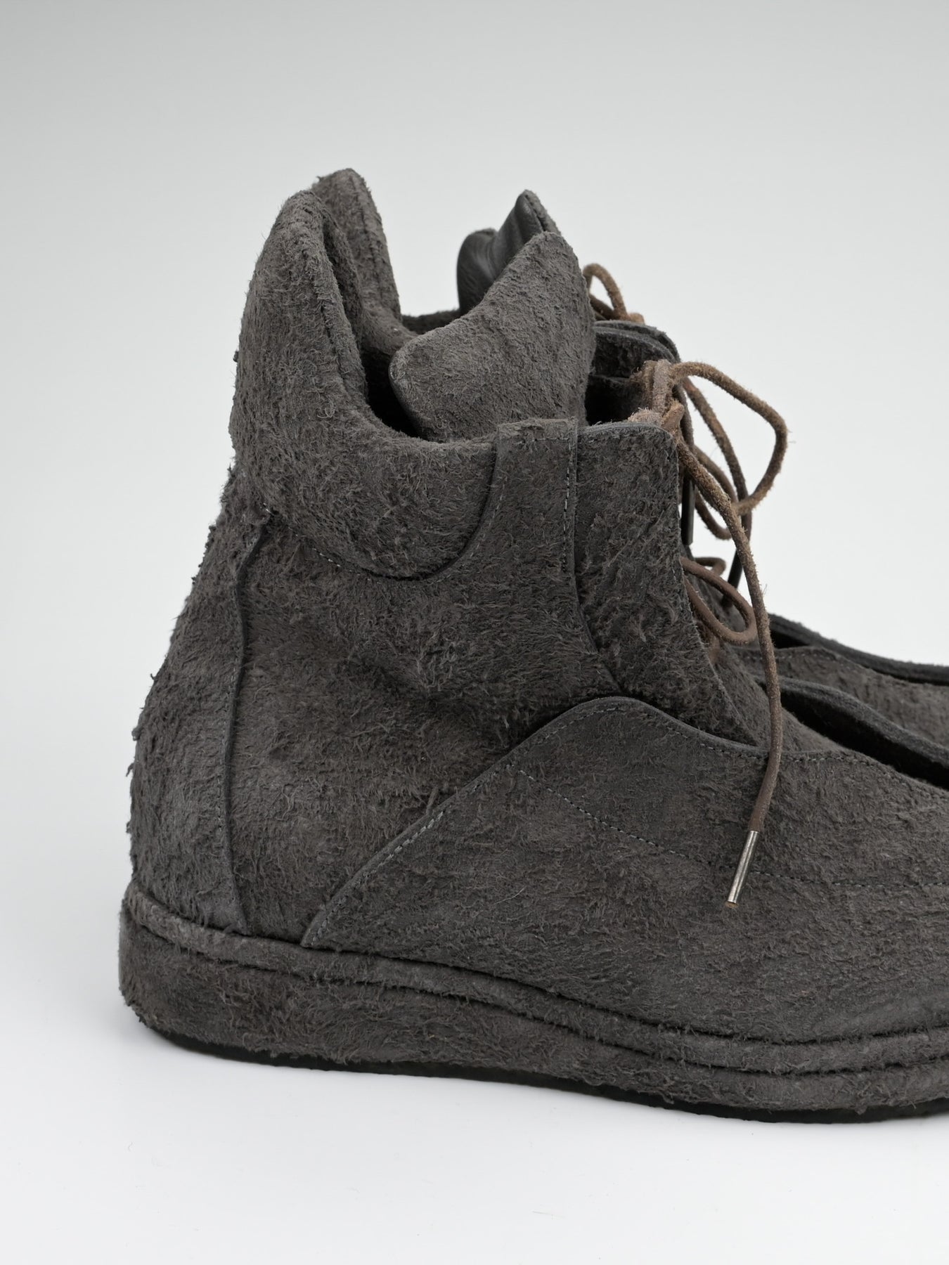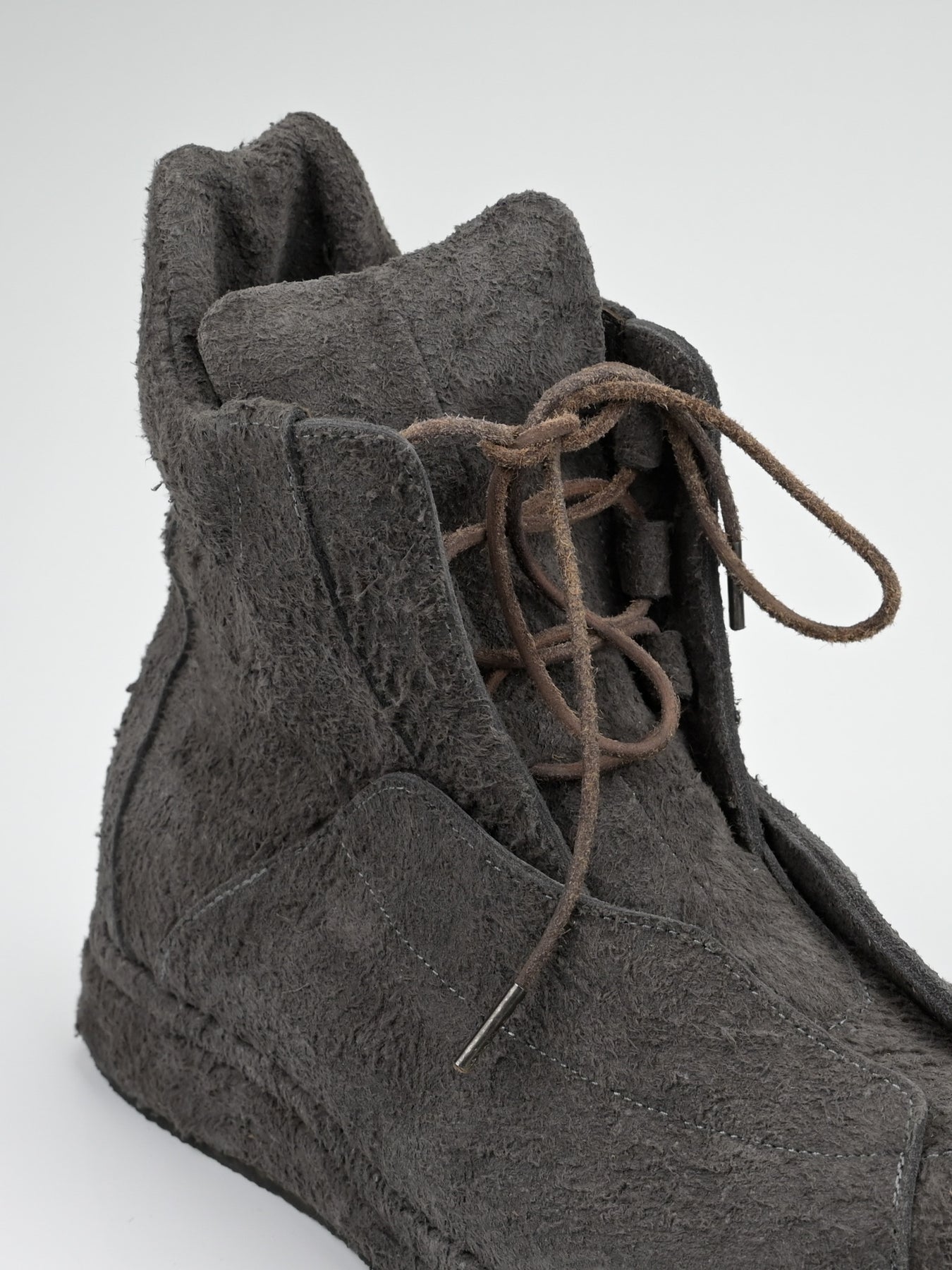 Boots in full grain flesh-out cowhide. Self-leather covered double layered midsole. Suede leather cord with metal tip.