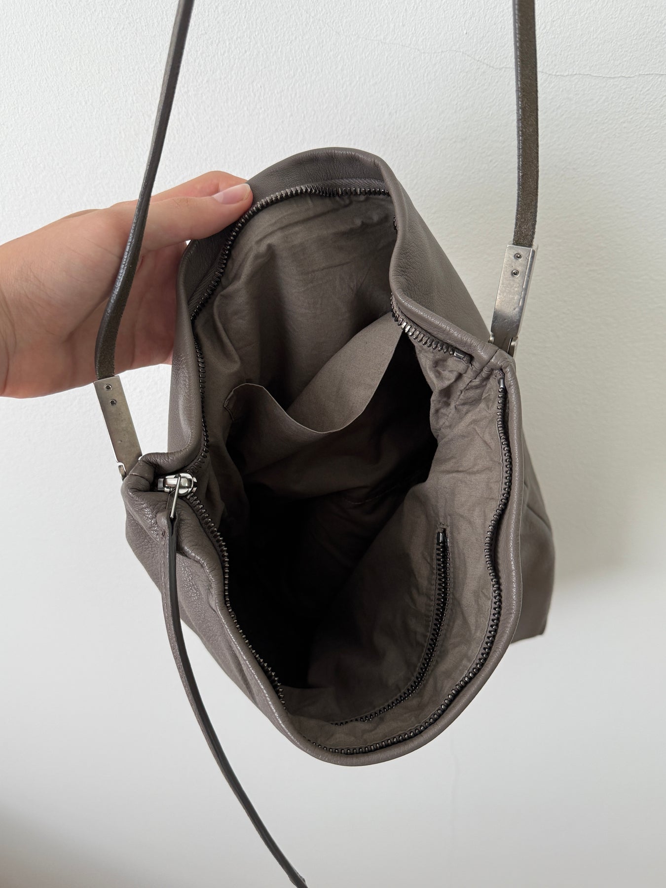 Super soft neutral brown leather shoulder bag detailed with top zip closure, silver-tone metal detail and leather shoulder strap, cotton lining featuring one inner zip pocket and an inner open one. Nylon Lining.