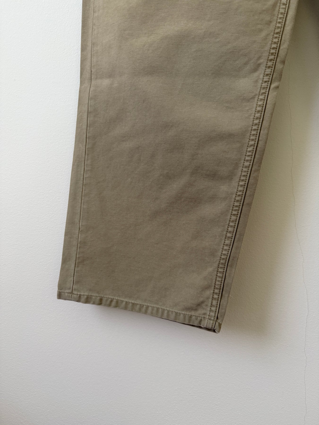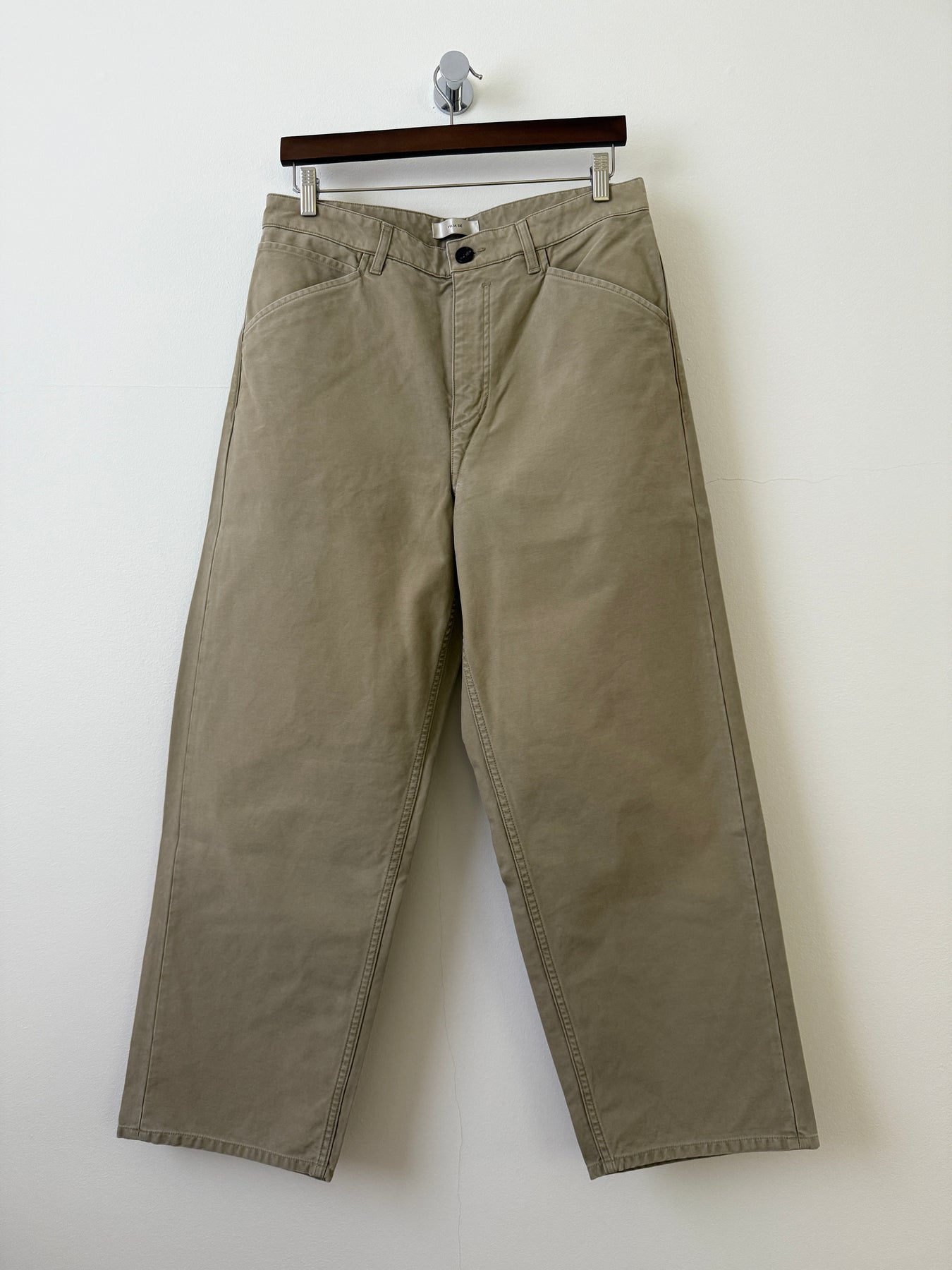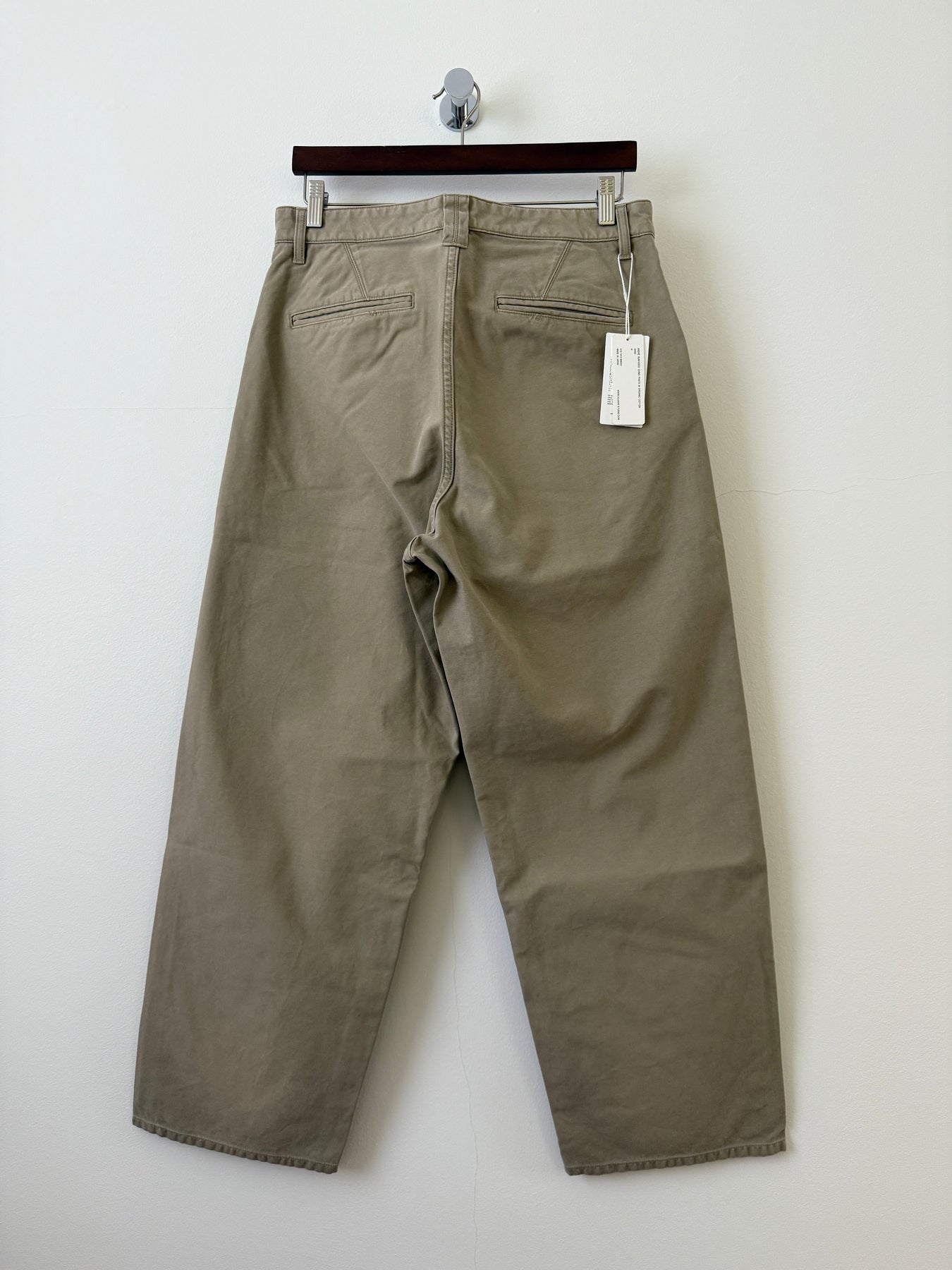 The classic chinos, reimagined as the modern uniform, is composed of organic supima cotton and has undergone a vat-dyeing and sun-fading treatment to achieve an aesthetic reminiscent of vintage chino pants. The chinos also feature a geometric design for the pockets and darts, which serve to enhance the functionality and overall silhouette of the garment.
