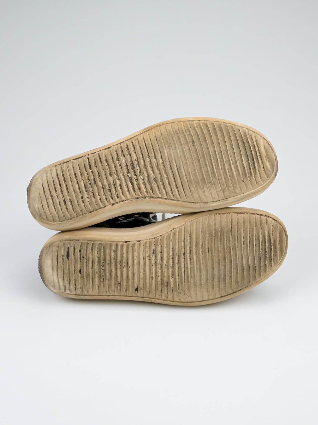This pair has a beautiful patina. Yellowed midsole gives these great character. Durable leather uppers. Timeless silhouette and color that will never go out of style.