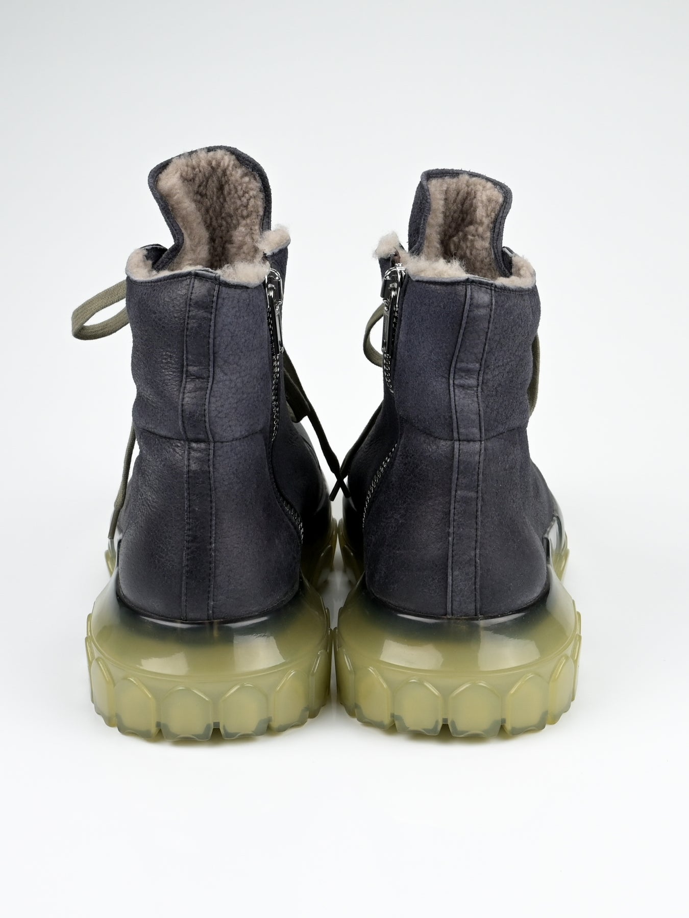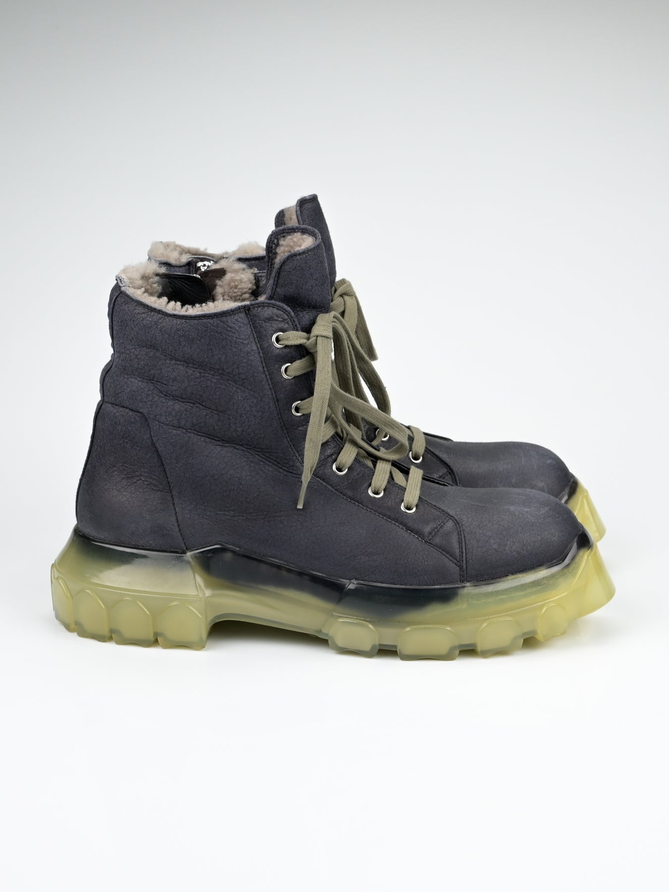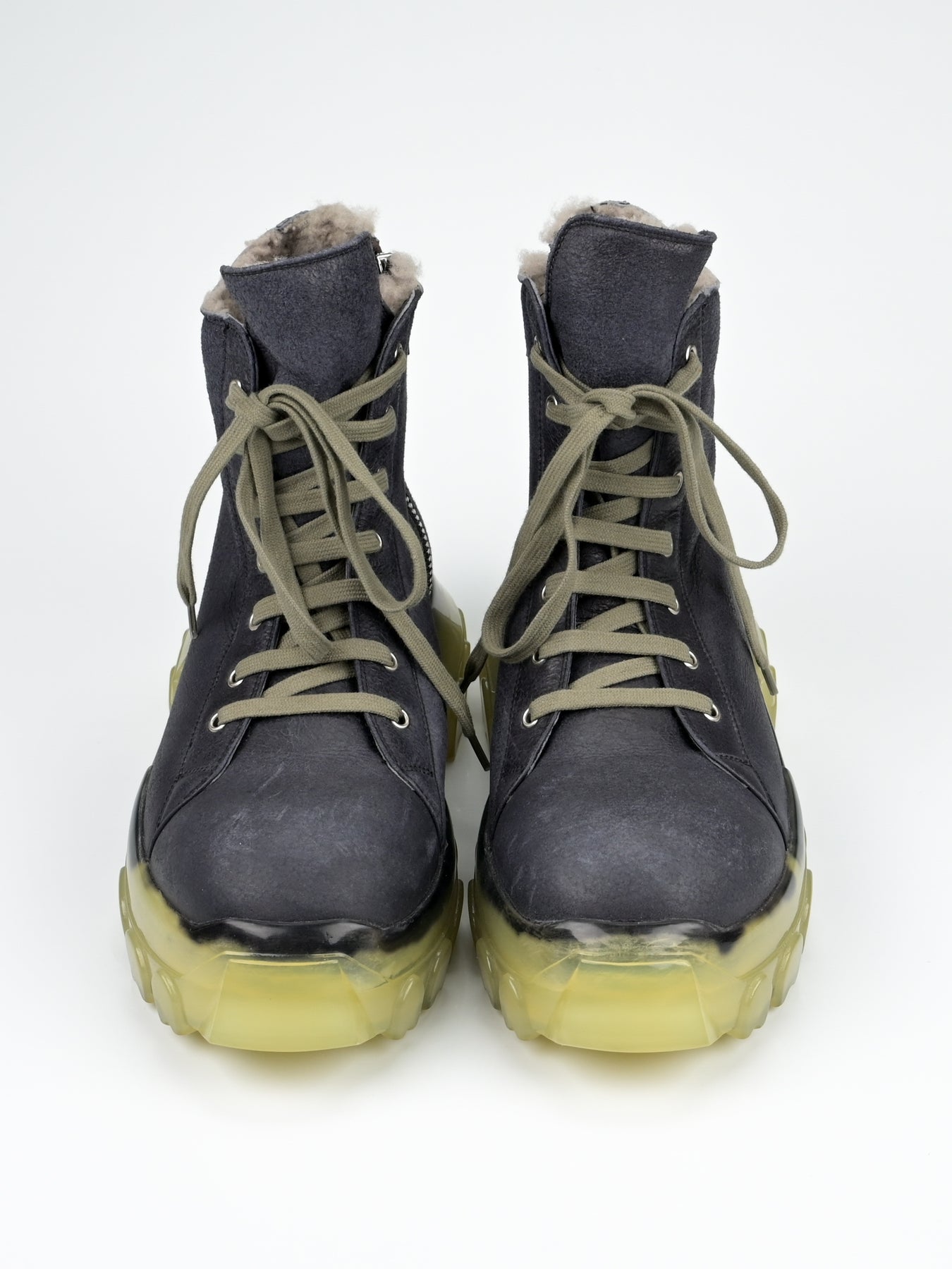 Leather is LSHC and is crazy soft and shows lots of natural variation. Color is black but is a bit ashy in color. Lot of variance. Super supple. Shearling lined. Transparent tractor sole.
