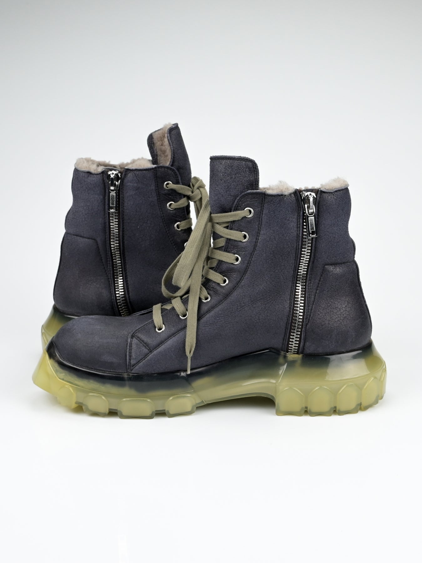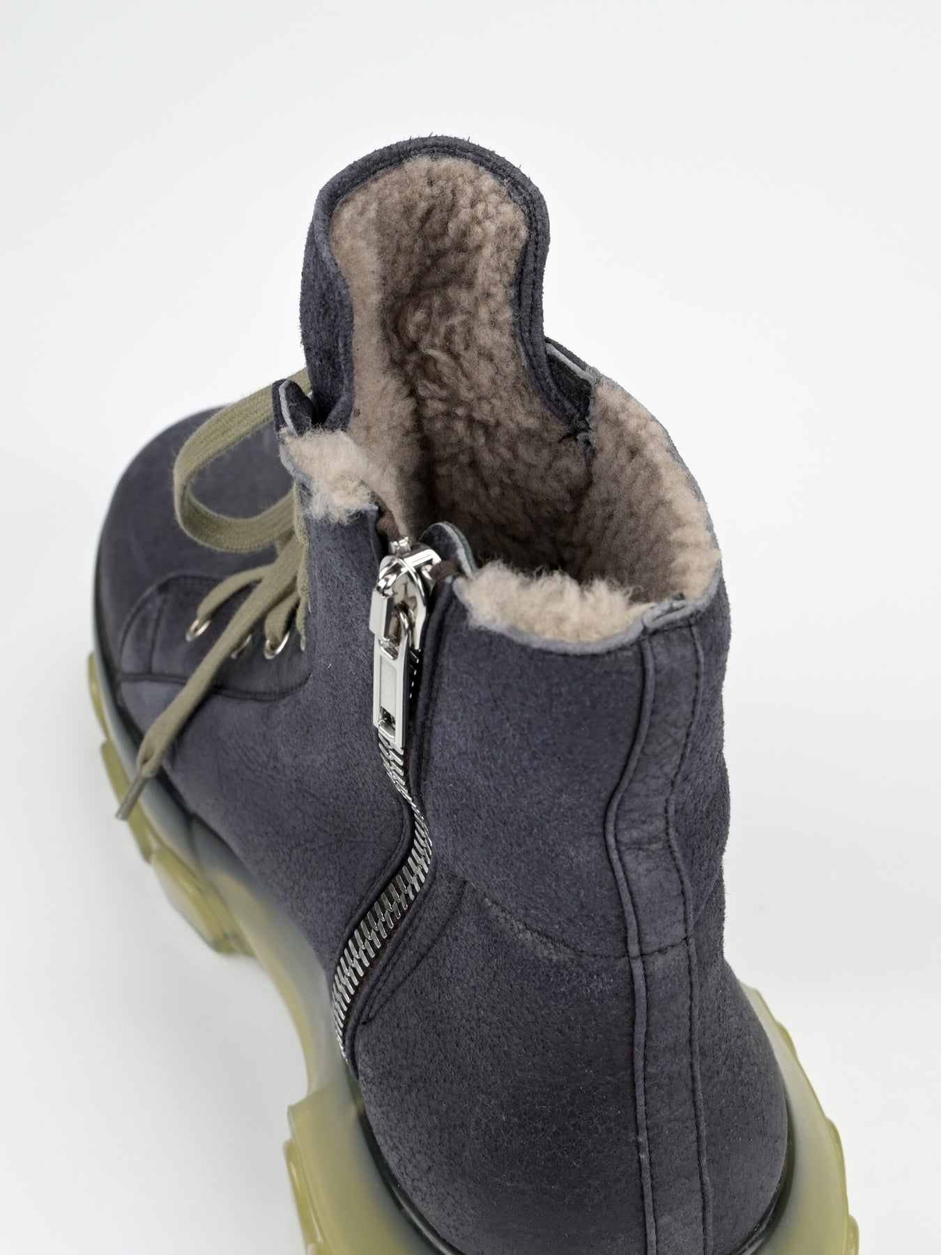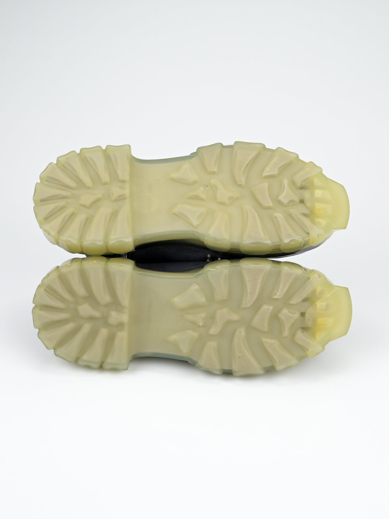 Leather is LSHC and is crazy soft and shows lots of natural variation. Color is black but is a bit ashy in color. Lot of variance. Super supple. Shearling lined. Transparent tractor sole.