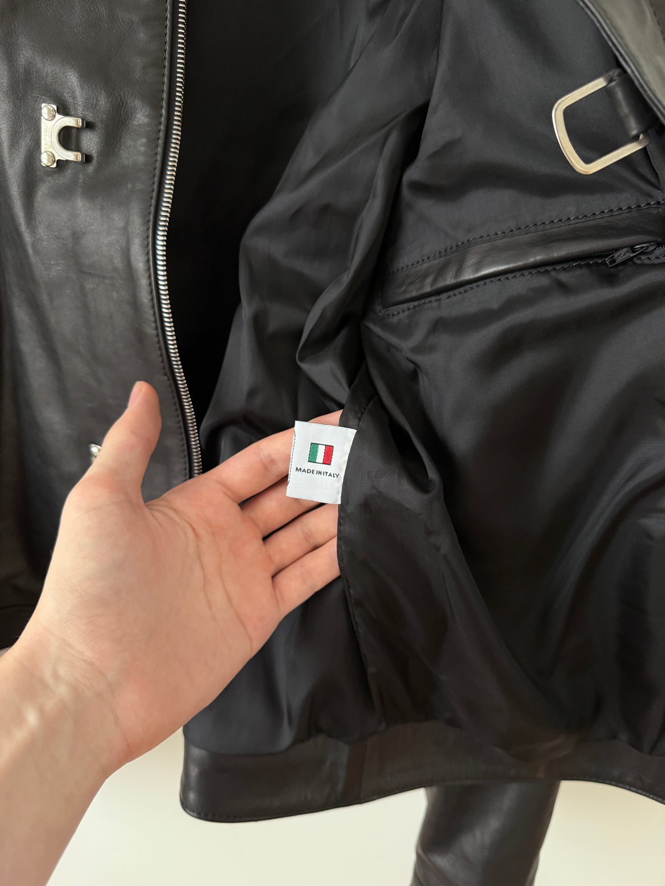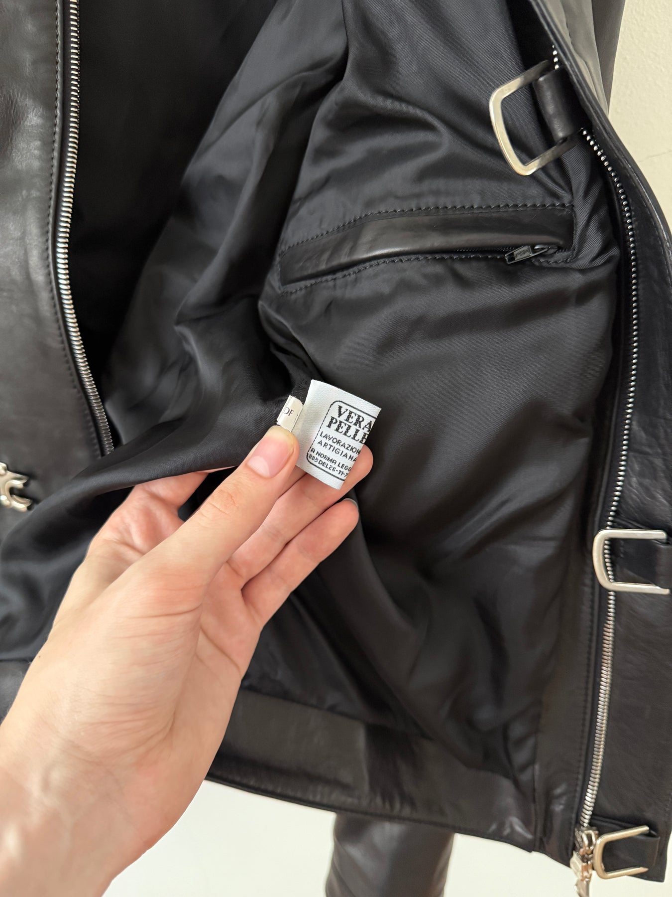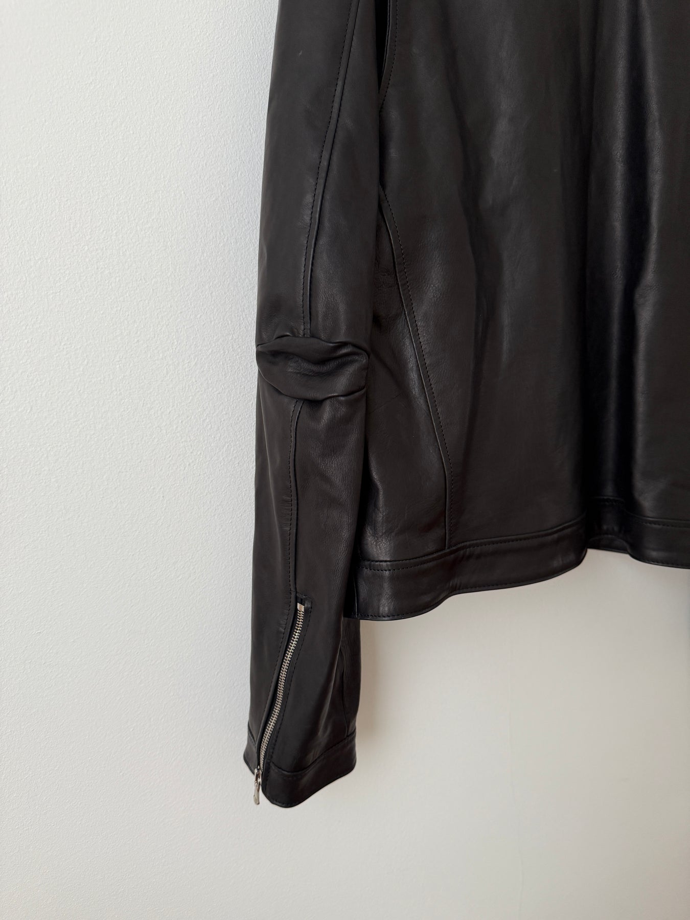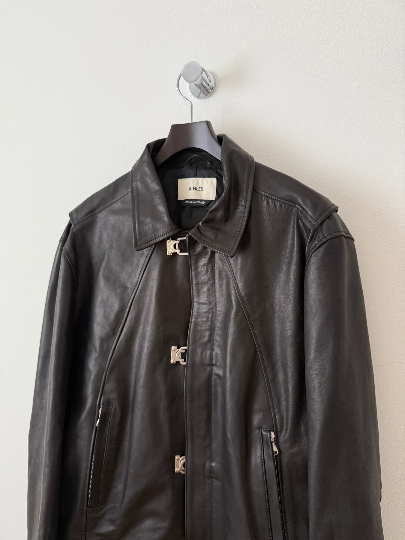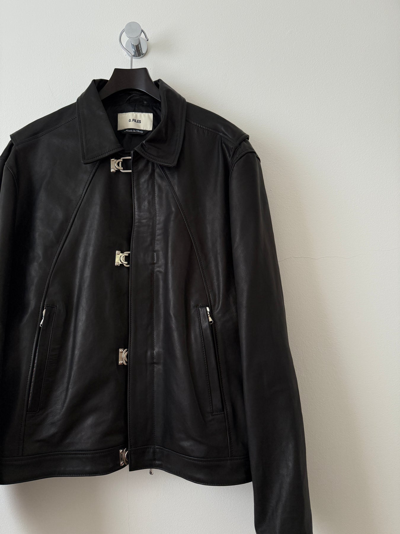 Everyday leather jacket with a shirt-style collar and a firefighter jacket inspired hook closure. Back shoulder flaps and elbow joint folds provide better movement. Handcrafted in south Italy. Made of hand-processed, softened & oiled calfskin nappa leather for the desired aged look. The silhouette is straight and sharp with a slight crop.